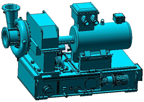 MVR離心蒸汽壓縮機采用整體組成撬結構型式。本體主要由壓縮機(定子部件、轉動部件、密封等組成)、齒輪增速箱、驅動系統(變頻電機+聯軸器及其護罩)、潤滑油路兼底座系統等組成。