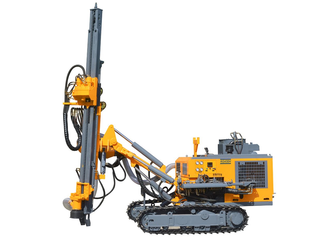 KG430/KG430H型露天潛孔鉆車是應國家對環保要求而進行升級的一款新設備。配備玉柴四缸國三發動機,滿足國家對排放和環保的要求。采用柱塞行走馬達,折邊履帶架和工程四輪一帶,提高工作壓力,增加爬坡性能。增大俯仰和舉臂油缸,滿足極限位置使用要求。同時對液壓系統升級,增大系統流量,提高回轉轉速。回轉器采用雙馬達減速器,增大回轉扭矩和轉速。對加大提升油缸和鏈條,提高提升力和可靠性。加固導軌和增加滑板上下耐磨板,延長使用壽命。導軌采用傾斜安裝,方便操作和觀察。罩殼采用加厚型材折邊,增加強度和剛性,增加起吊吊環,方便裝卸吊裝。