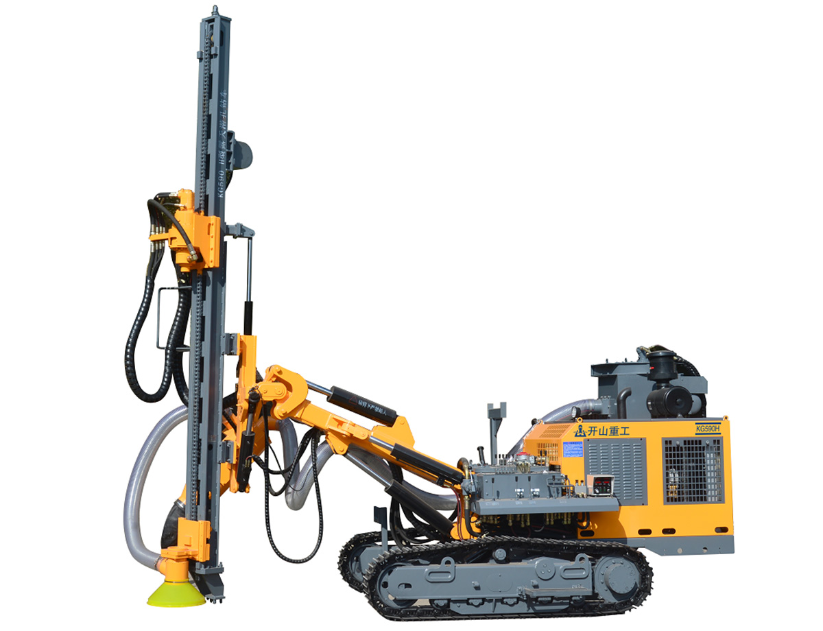 KG590/KG590H型露天潛孔鉆車是應國家對環保要求而進行升級的一款新設備。配備玉柴四缸國三發動機,滿足國家對排放和環保的要求。采用柱塞行走馬達,折邊履帶架和工程四輪一帶,提高工作壓力,增加爬坡性能。增大俯仰和舉臂油缸,滿足極限位置使用要求。同時對液壓系統升級,增大系統流量,提高回轉轉速。回轉器采用大馬達減速器,增大回轉扭矩和轉速。對加大提升油缸和鏈條,提高提升力和可靠性。加固導軌和增加滑板上下耐磨板,延長使用壽命。導軌采用傾斜安裝,方便操作和觀察。罩殼采用加厚型材折邊,增加強度和剛性,增加起吊吊環,方便裝卸吊裝。