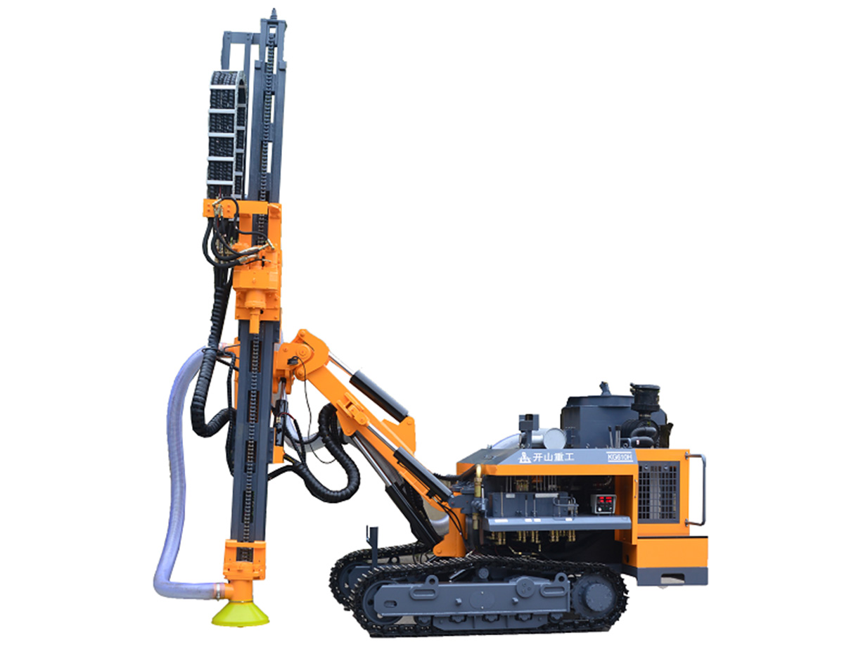 KG610/KG610H型露天潛孔鉆車是應國家對環保要求而進行升級的一款新設備。配備玉柴四缸國三發動機,滿足國家對排放和環保的要求。采用柱塞行走馬達,折邊履帶架和工程四輪一帶,提高工作壓力,增加爬坡性能。增大俯仰和舉臂油缸,滿足極限位置使用要求。同時對液壓系統升級,增大系統流量,提高回轉轉速。回轉器采用雙馬達減速器,增大回轉扭矩和轉速。對加大提升油缸和鏈條,提高提升力和可靠性。加固導軌和增加滑板上下耐磨板,延長使用壽命。導軌采用傾斜安裝,方便操作和觀察。罩殼采用加厚型材折邊,增加強度和剛性,增加起吊吊環,方便裝卸吊裝。